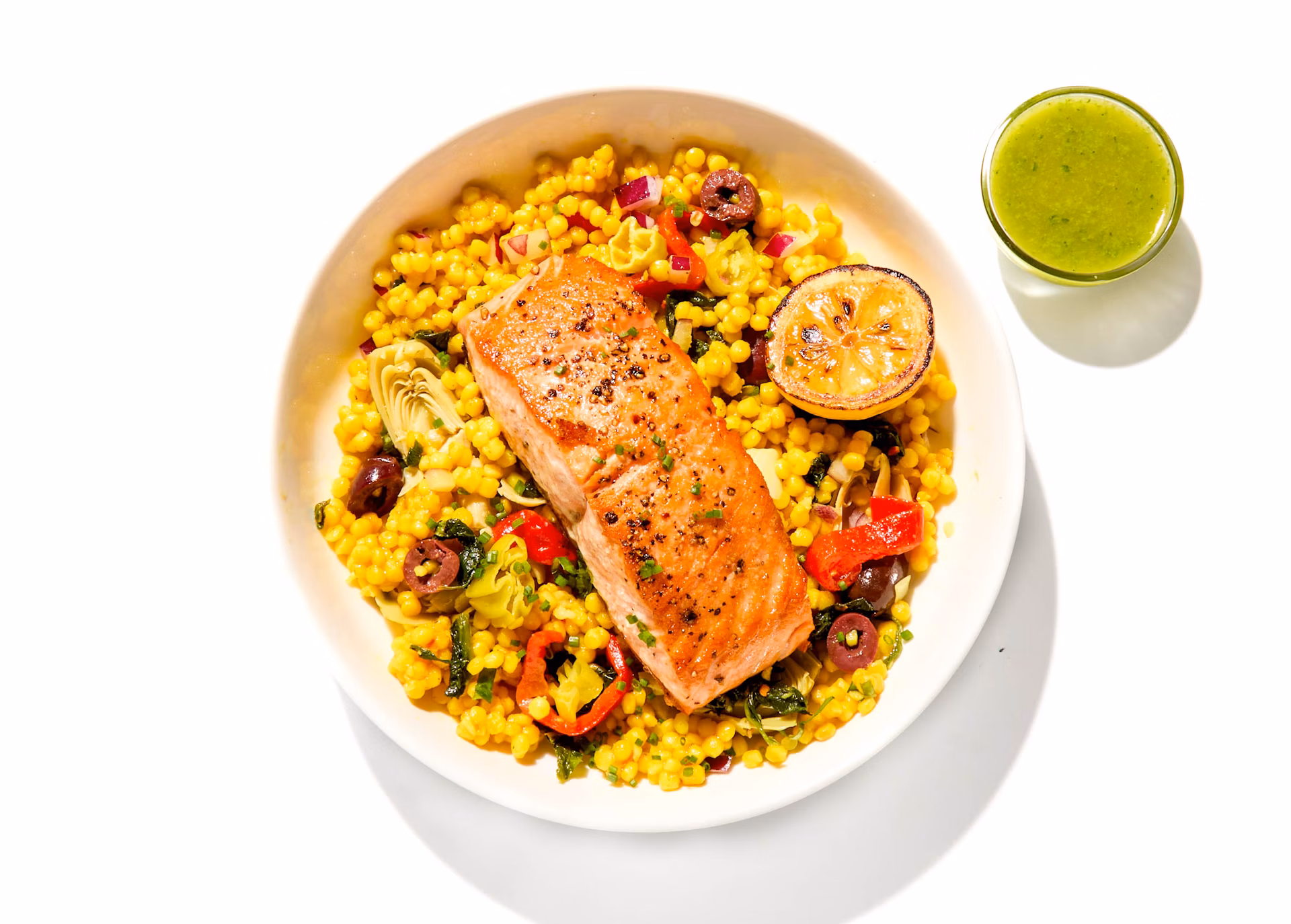 vibrant couscous salad captures the essence of Mediterranean flavors in every bite. It's bursting with flavorful veggies like Kalamata olives, pepperoncini, roasted red peppers, artichoke hearts, and spinach, as well as aromatic fresh basil. Paired with grilled salmon as well as charred lemon this dish is perfectly balanced and ready to be enjoyed as a light dinner or satisfying midday meal.